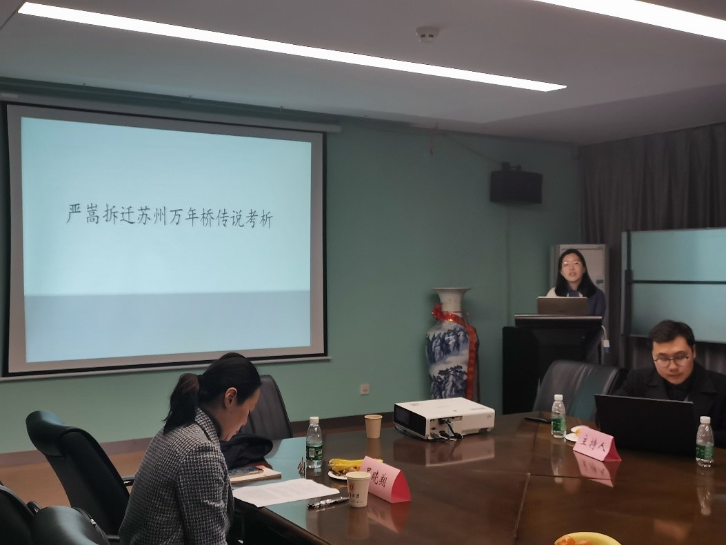 第一位报告人为中国古代史2018级博士生范佳,题目是《严嵩拆迁苏州万年桥考析》。该文利用历史考辨的方法,在充分运用分宜、苏州两处建桥碑文资料的基础上,结合方志、文集等史料,论述了严嵩拆迁苏州万年桥传说的争议、分宜万年桥的修建过程、清乾隆苏州万年桥的修建以及胥门浮桥兴废与风水之说,最后分析了拆迁传说的成因。作者认为,“苏州胥门的风水传说,才是证明万年桥传说为缪传的关键,分宜万年桥移桥传说与严嵩贪刻形象联系在一起,加强了清初严嵩奸臣形象的塑造”。
