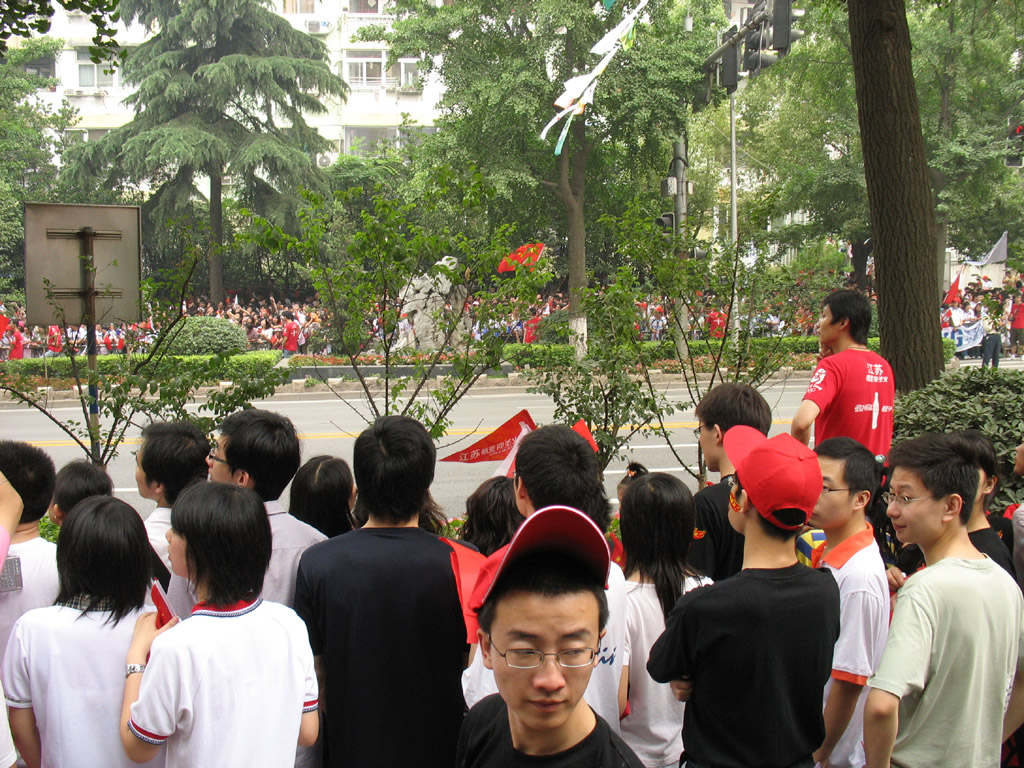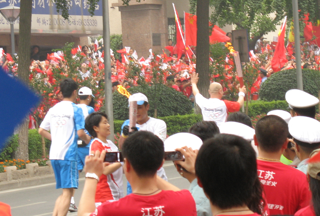 2008年5月27日,大家期待已久的奥运火炬到达金陵。南京城万人空巷,盛况空前。本系志愿者一行20余人,在北京西路东端守候圣火,亲眼目睹了这百年盛事。 众人在焦急等待 火炬交接那一刻 (照片由夏武华同学提供)