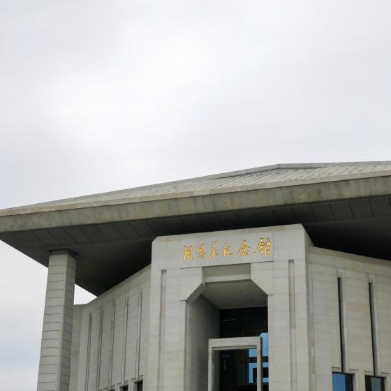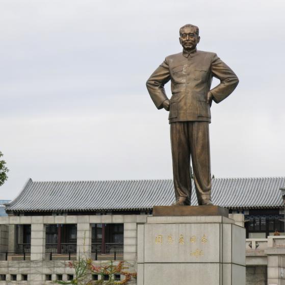 在距离周恩来故居约两华里的地方,是周恩来纪念馆,也是我们参观的第二个景点。斯人已逝,丰碑永存。纪念馆坐落在淮安北门外夹城内桃花垠的一个三面环水的湖心半岛上,整个建筑造型庄严肃穆,形式朴实典雅,既有传统的民族风格,又有现代建筑特色。拾级而上,步入展厅,迎面耸立着一座3米高的周恩来铜像,展现着总理的伟岸风采。站在纪念馆的顶层,俯瞰全景,我们看到了由纪念岛和三个人工湖构成的汉字“忠”字形,独具匠心。行于道上,凉风习习,醉人的绿与晶莹的湖映入眼帘,小湖里,黑天鹅、锦鲤在自由地活动,使人陶醉。