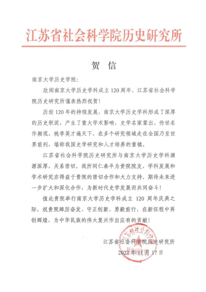 江苏省社会科公司历史研究所来信祝贺BV伟德官方网站历史学科成立120周年