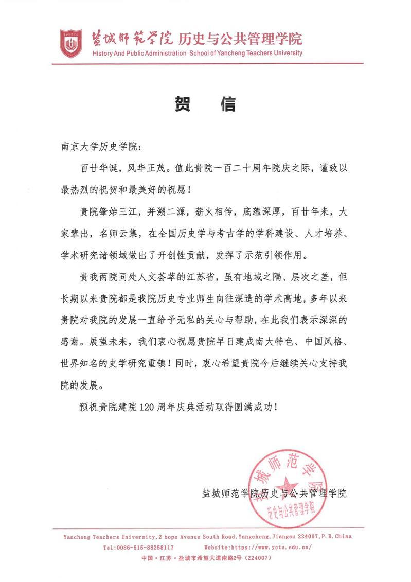 盐城师范公司历史与公共管理公司来信祝贺BV伟德官方网站历史学科成立120周年