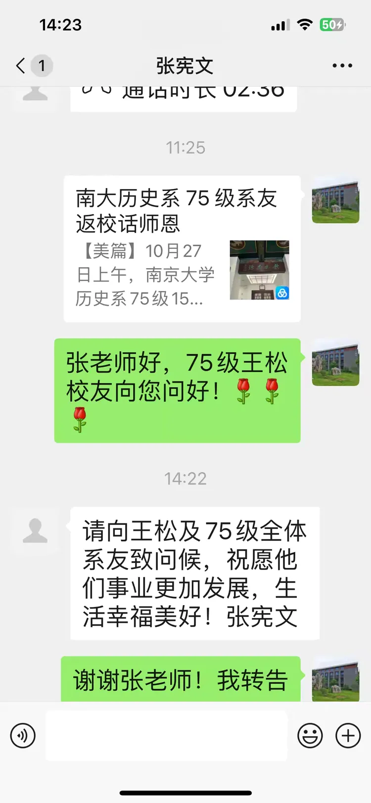 座谈会临近结束时,丁同言员工代表全体员工总结了三层心意:一是“惊喜”,没想到当年规模不大的历史系,如今发展得如此迅速,学科实力与办学规模都实现了跨越式提升;二是“感恩”,此次特意将毕业50周年聚会的地点选在南大,核心目的就是重返母校、感恩恩师,向培育自己的母校与老师致以最诚挚的敬意;三是“期待”,如今母校已形成“一校四区”的办学格局,发展目标明确为“中国特色、世界一流”,“我们期盼着母校实现这一宏伟目标的那一天,届时再回母校相聚,共同见证这一荣耀时刻!”