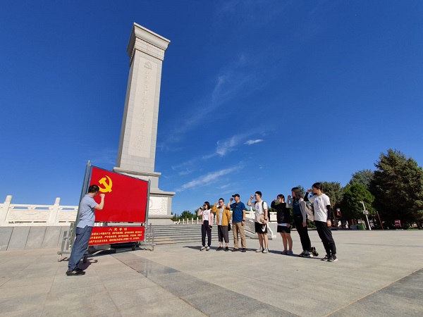 实践考察团队中的党员师生们在“红军西路军烈士永远活在我们心中”纪念碑前重温党员誓词。艳阳高照,“我志愿加入中国共产党,拥护党的纲领……”铿锵有力的宣誓之声在纪念馆上空久久回荡。