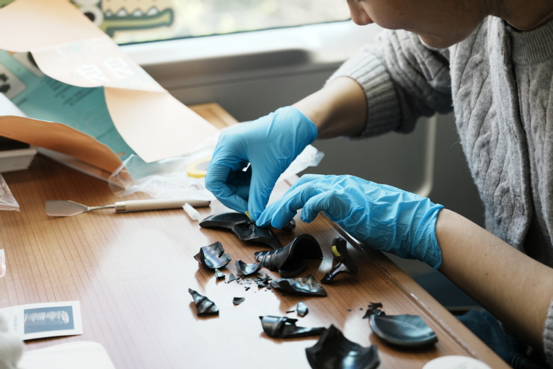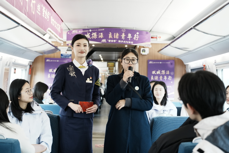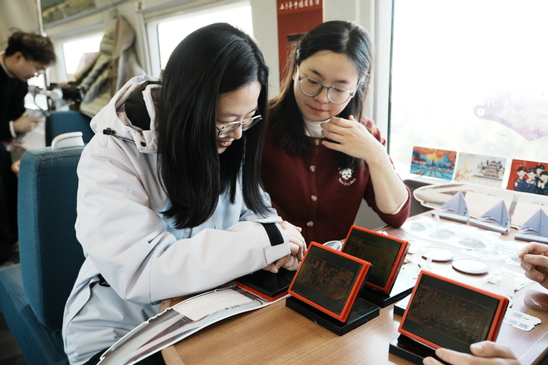 12月6日上午,参访团队在前往杭州的G7581次列车上,通过特色拼图、VR眼镜、打卡盖章等活动体验了“良渚文化进高铁”。