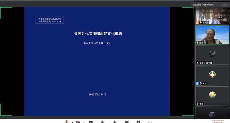 应华东师范大学BV伟德官方网站的邀请,我院于文杰教授于2020年6月24日下午在“大夏世界史讲坛高端讲座”上发表演讲,演讲的题目是:《英国近代文明崛起的文化渊源》,来自高校和科研院所的师生300余人聆听了讲座。讲座由世界历史研究院经理沐涛教授主持。