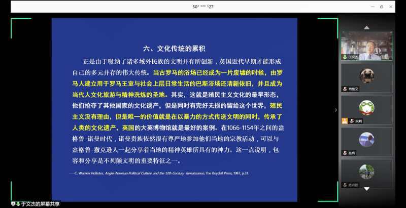 于文杰教授从“一、宗教信仰的率先确立;二、古典文明的充分摄取;三、异质文明的有效融合;四、大学精神的普遍建树;五、法律体制的较早形成;六、探险意识的自由成长;七、文化积累的全面完成”等七个方面阐述了自己近几年来对该问题研究的最新成果与看法。于教授认为,我们对英国文明史的理解,不能简单地接受西方人的所谓“生而自由”与“渐进主义”等观点,我们应该用学习、批判和创新的态度,在西方学人和中国先辈们的研究成果的基础上,建立新时代的历史书写与话语体系。