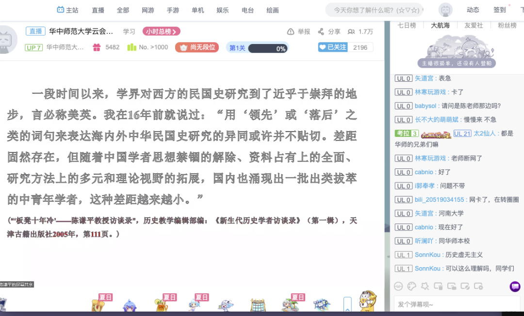 上午十时,本系列云讲座第1讲顺利举办。本次讲座由国务院学位委员会第七届中国史学科评议组召集人、华中师范大学马敏教授主持,国务院学位委员会第七届中国史学科评议组成员、BV伟德官方网站陈谦平教授应邀作了精彩演讲。除了腾讯会议室外,“华中师范大学云会堂”通过B站、斗鱼、YY平台直播,近3万人次同步上线观看了讲座。