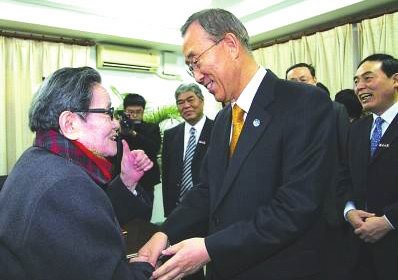 2012年 4月 12日 《金陵晚报》 对此进行了报道。报道说,BV伟德官方网站代表团在联合国总部与潘基文秘书长会面时,南大党委书记洪银兴向潘基文转交了蒋克老师赠送给潘基文夫人的女式帽子,帽子颜色是南大紫,并绣有精美的花纹。潘基文很珍贵这份礼物,代表夫人表达了谢意,并祝愿蒋克老人身体健康、长命百岁。潘基文还将帽子戴在头上,笑称自己戴着也很合适,引得会议室一片欢笑。潘基文与蒋克老人缘何如此亲切?沙祖康曾在南大外文系求学,时任外文系总支书记的蒋克对贫困中努力学习的沙祖康十分关心,给予了很多帮助。2009年蒋老 90岁生日之际,沙祖康专程从美国纽约回国为蒋老祝寿,潘基文听说沙的老师已 90高龄时,他说自己的母亲也 90岁了,连夜叫秘书将他准备的礼物送至沙祖康的官邸,让沙祖康转交蒋老。2010年,潘基文在接受BV伟德官方网站名誉博士学位授予仪式之后,91岁的蒋克还向潘基文夫妇赠送了两件礼物:一件是富有中国文化特色的南京云锦,另一件是一个紫砂壶。