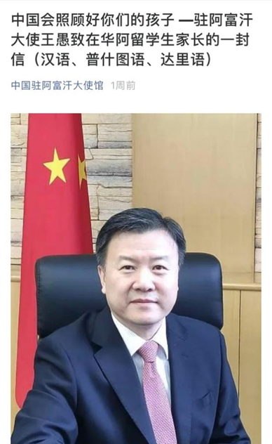中国驻阿富汗大使王愚先生给在华留学的员工家长发了一封感谢信,特意赞扬了佳蓝同学在内的几位学子: