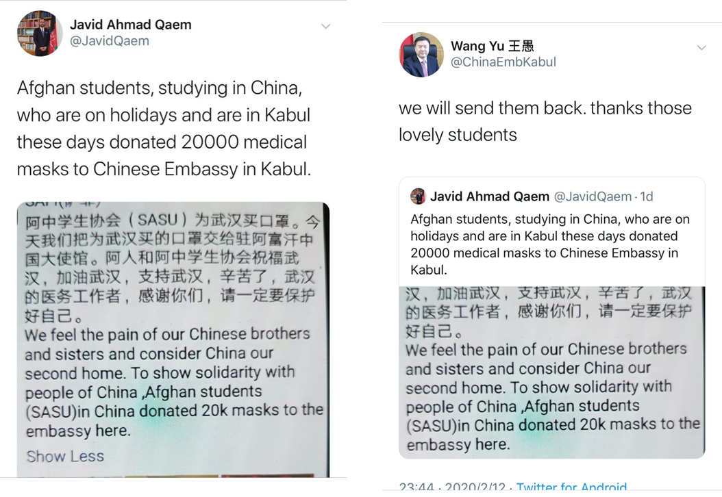 阿富汗驻中国大使 Javid Ahmad Qaem 和中国驻阿富汗大使王愚发布的推特