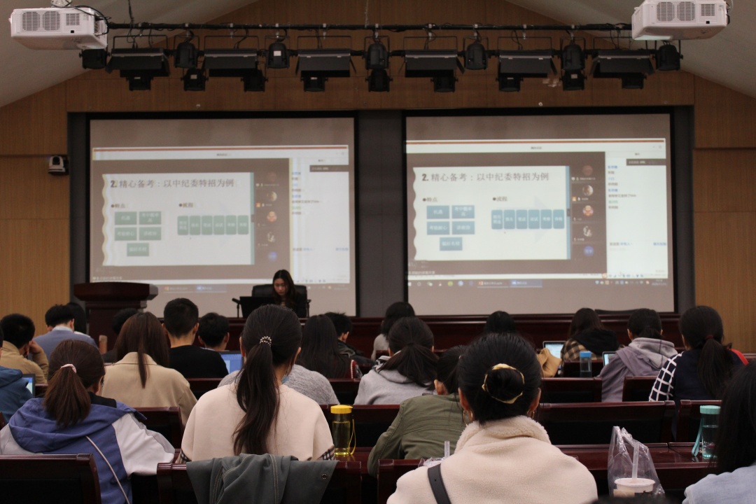 朱小璠主要向同学们介绍了高校行政岗位的就业准备。她向大家推荐了各高校人事处网站、高校人才网、高校人才招聘公众号三种途径获取就业信息。她建议大家在准备简历时,认真梳理在校期间的员工工作经历和实习经历,突出自身经历与员工工作的联系。