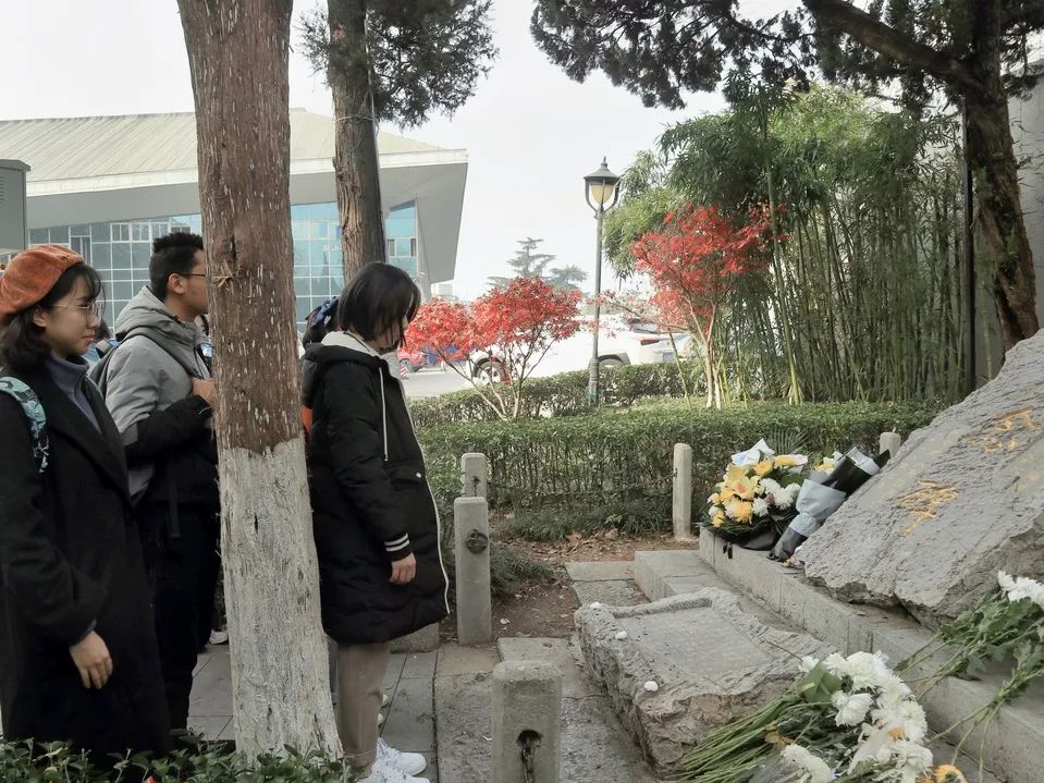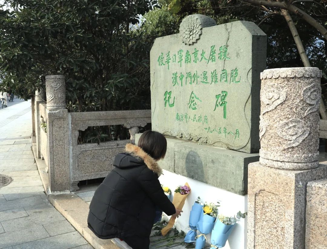 同学们在草鞋峡丛葬地纪念碑、中山码头丛葬地纪念碑、挹江门丛葬地纪念碑、北极阁丛葬地纪念碑、太平门纪念地纪念碑、五台山丛葬地纪念碑、汉中门外丛葬地纪念碑,一同为遇难同胞献花并默哀。