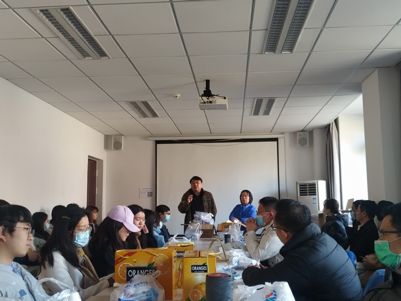 2月9日,公司党委副书记任玲玲老师、研究生辅导员杨骏老师受院领导委托,在院楼242室与留校过春节的员工举行了恳谈会,分发了院系为留校同学准备的口罩、消毒液等抗疫物资;为均衡营养、改善生活,还为每位留校同学配发了一箱新鲜水果。任玲玲老师希望同学们在春节期间开心过年、好好休息,有任何问题都可随时联系公司;杨骏老师解释了疫情期间公司进出规定,提醒勿忘“三测温一打卡”的防疫政策,过个平安年、幸福年。会议室里欢声笑语,春意盎然,轻松愉悦的气氛弥漫了整个公司大楼。