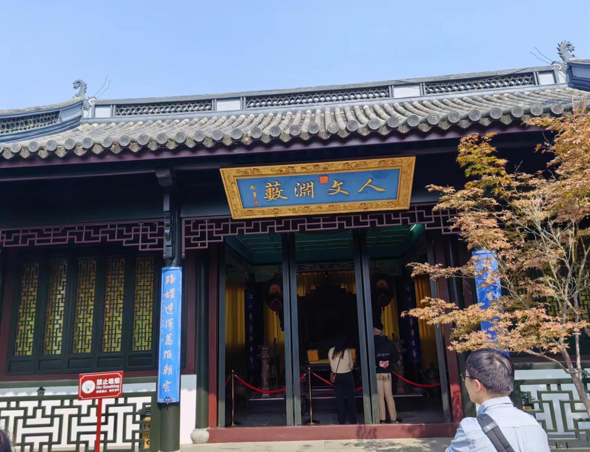 10月15日早9:00,用过早餐后,师生乘车抵达金山。金山原是屹立于长江中流的一个岛屿,有“江心一朵美芙蓉”之称誉。水漫金山的故事耳熟能详,白娘子的传说为这里增添了诸多传奇色彩。走进园区,绿树成荫,两列风铃叮当作响,有山水寺宇,亭台楼阁,江南历史与文化独特而清新的馥郁扑面而来。