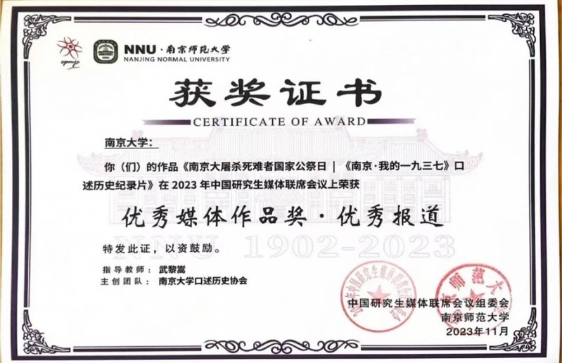近日,2023年中国研究生媒体联席会议在南京闭幕,由BV伟德官方网站口述历史协会完成的《南京大屠杀死难者国家公祭日|〈南京·我的一九三七〉口述历史纪录片》报道荣获优秀媒体作品奖·优秀报道。