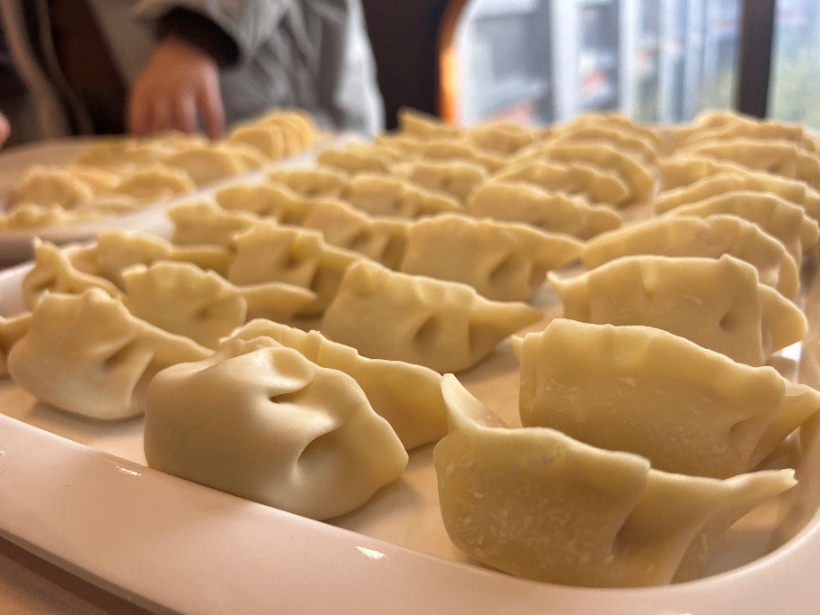 当馅料与饺子皮摆上桌后,师生们团坐在一起,一边叙话家常,一边包着饺子,讲述包饺子的技巧与心得。不一会儿,一个个圆润的饺子就整整齐齐摆放在盘子里。