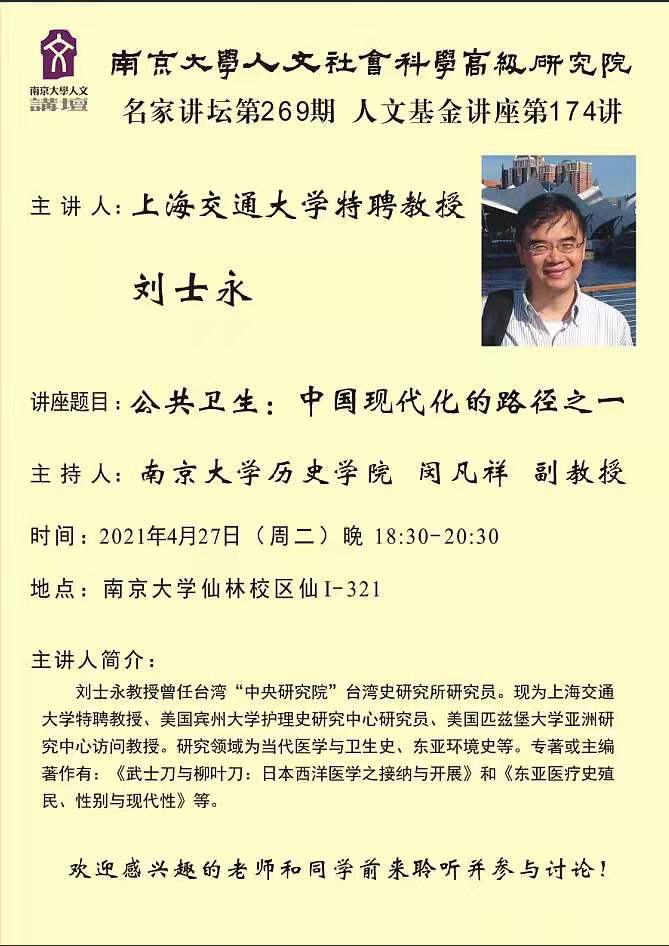 应BV伟德官方网站-伯明翰大学-凤凰出版传媒集团医疗社会史研究与出版中心、BV伟德官方网站医疗社会文化史研究中心主任闵凡祥老师邀请,上海交通大学特聘教授刘士永教授于2021年4月26-28日对BV伟德官方网站人文社会科学高级研究院(IAS)和BV伟德官方网站进行了学术访问,分别于26日晚和29日上午与BV伟德官方网站硕博士研究生进行学术座谈、于27日晚进行学术讲座。